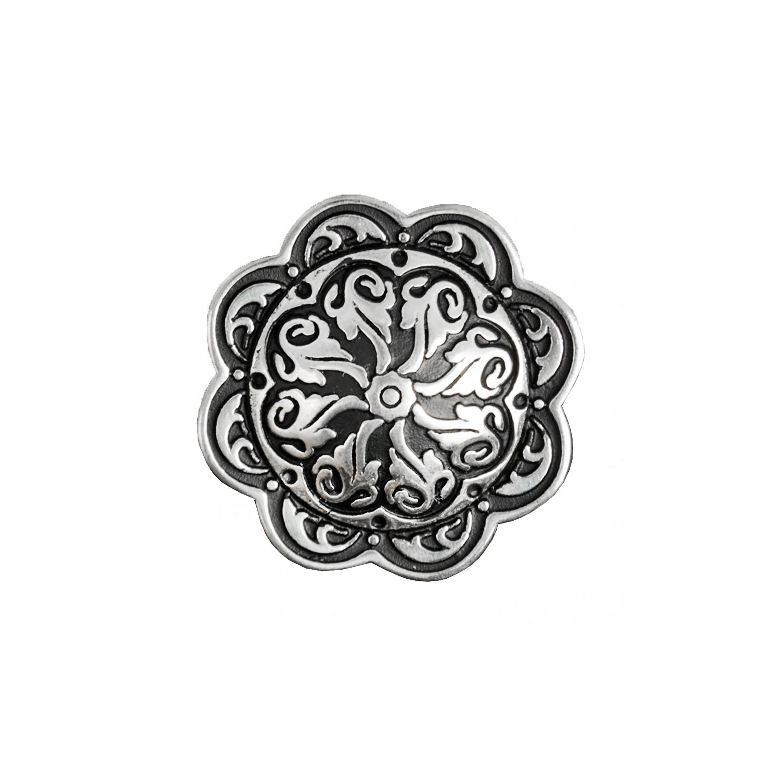 These classic scalloped Conchos have a floral pattern and dark background and are made of stainless steel. They can be used for decorative accents for bridles, martingales, saddle bags or western spur straps. This Concho attaches with a wire loop back.