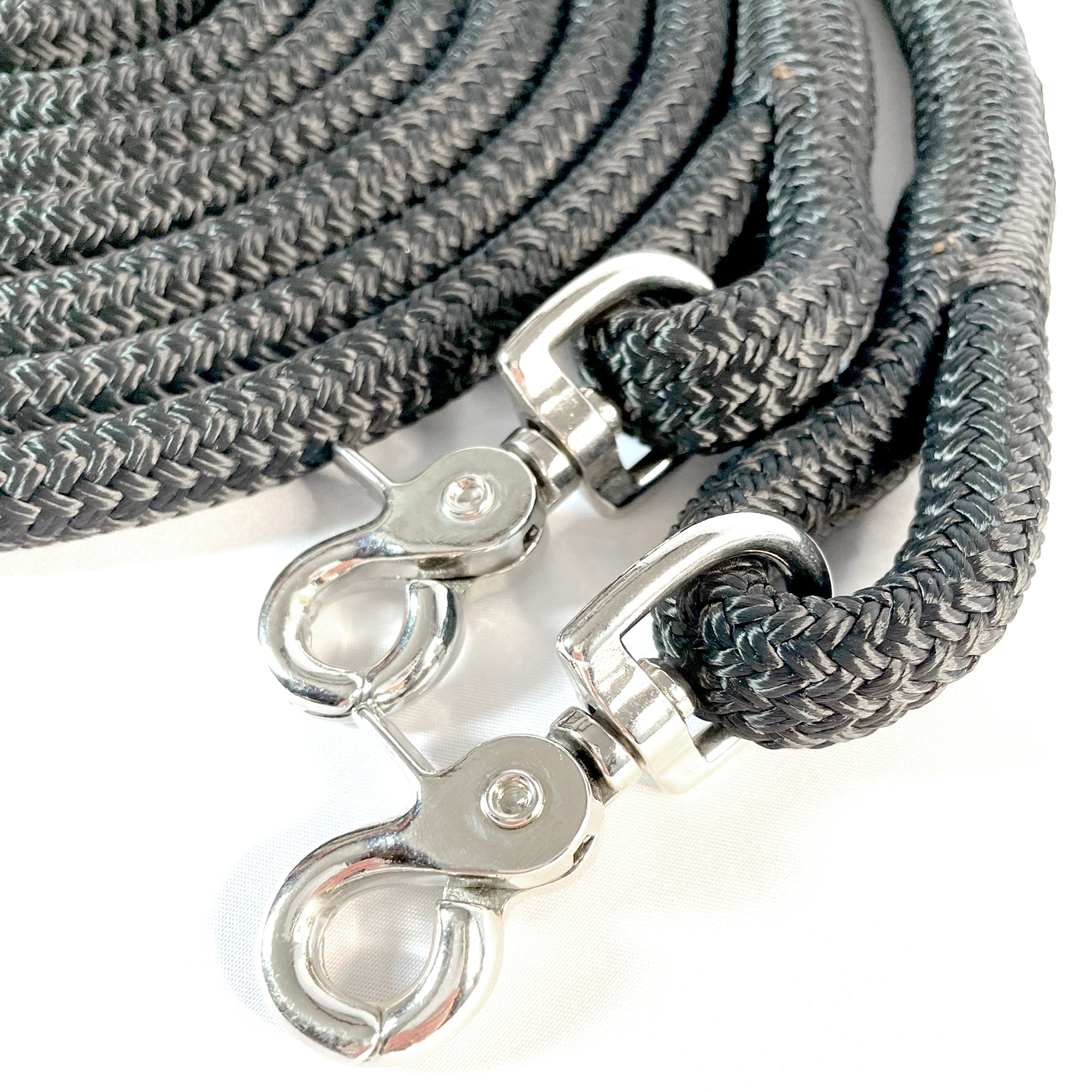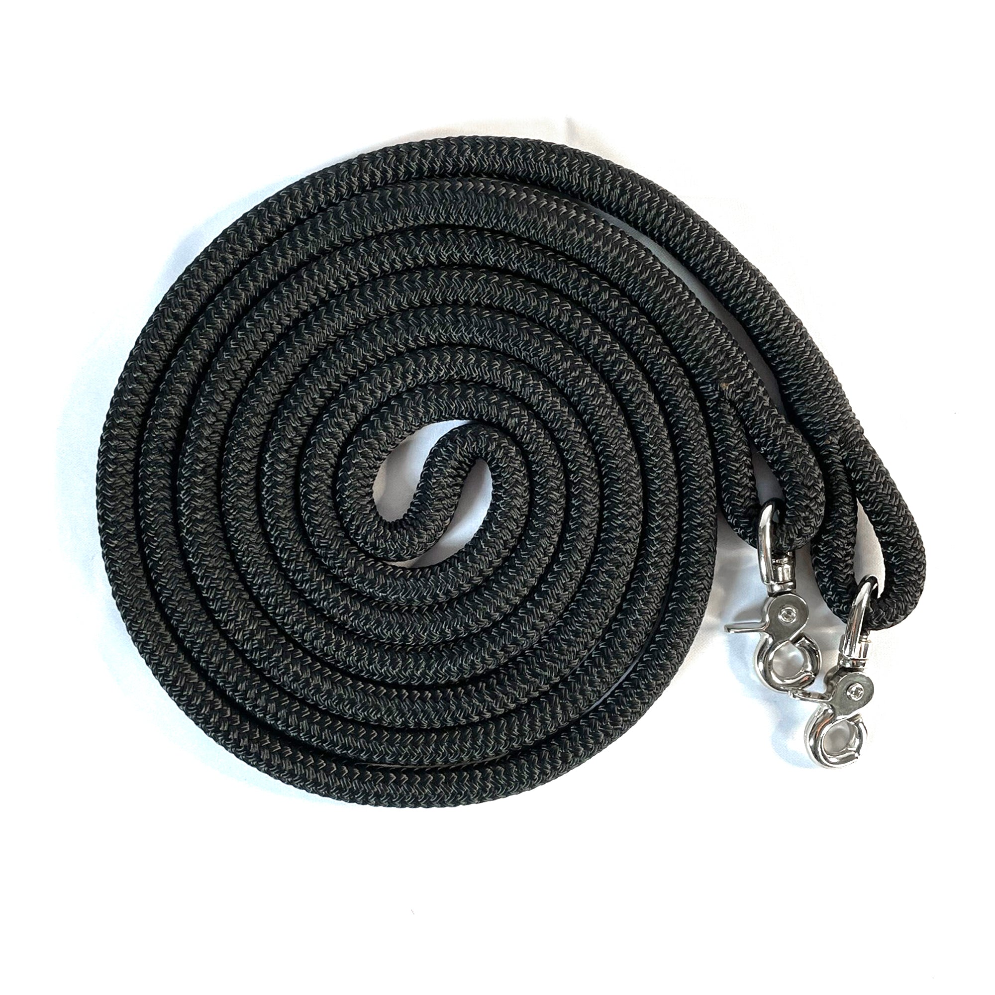 At Total Horsemanship, we use of 100% polyester rope over the typical nylon yachting rope. Unlike nylon, which can stretch, become stiff with use, absorb moisture, and increase in thickness, polyester rope maintains its original form. This ensures that our lead rope will provide consistent performance and durability, even with regular use.